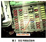 根據(jù)圖2保險(xiǎn)絲說(shuō)明檢查發(fā)現(xiàn)B32保險(xiǎn)絲缺失,而旁邊B31號(hào)本應(yīng)該是空位,插了一個(gè)15A的保險(xiǎn)絲,剛好與缺失的B32號(hào)保險(xiǎn)絲相同。