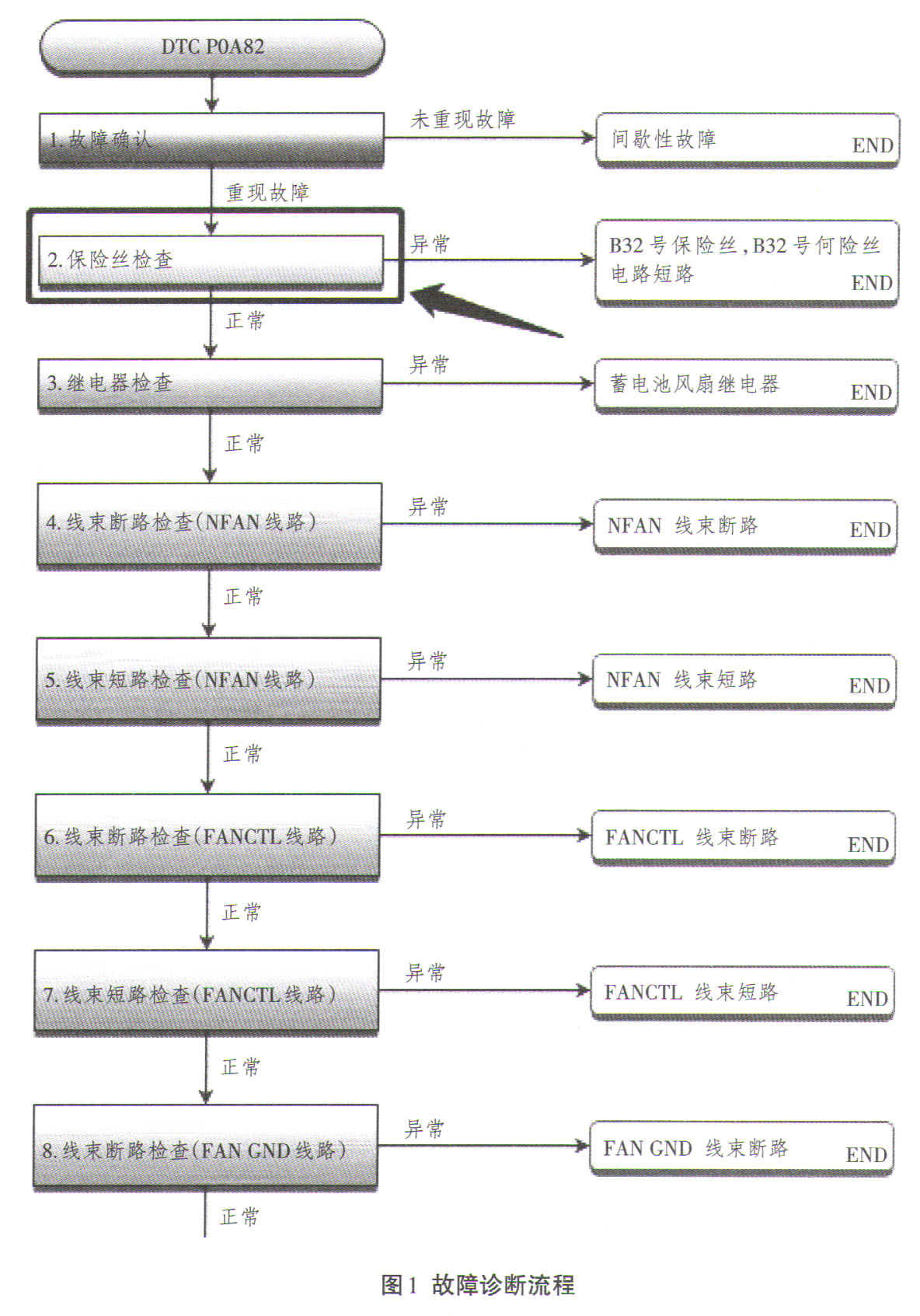(2)檢查保險(xiǎn)絲:根據(jù)故障診斷流程,如圖1所示,遵循先易后難原則,先檢查保險(xiǎn)絲B32。