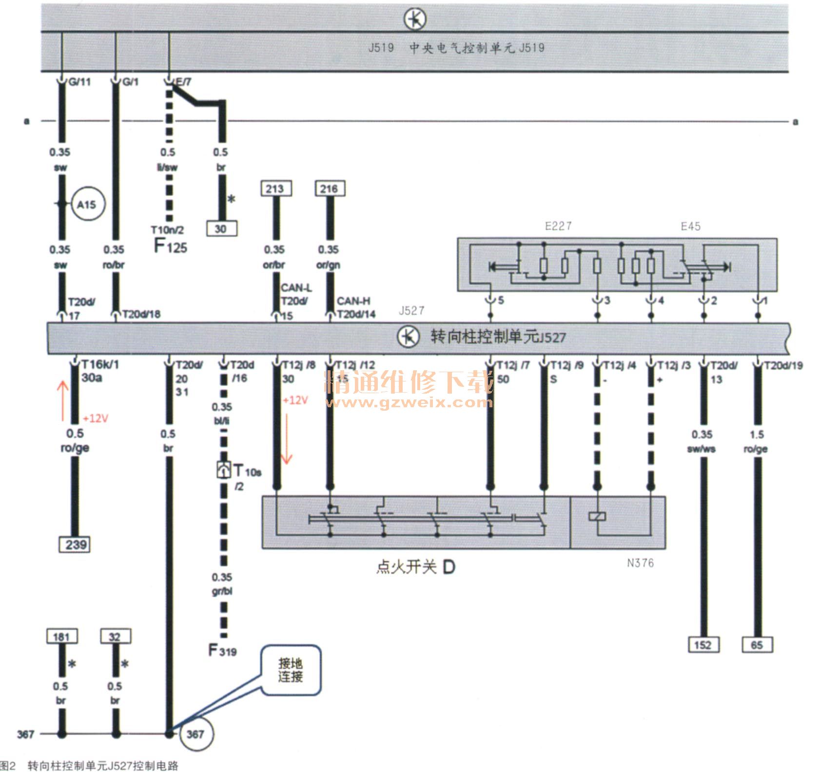 維修人員首先思考此車型點火開關(guān)控制原理,該車型點火開關(guān)與傳統(tǒng)點火開關(guān)有明顯的不同,傳統(tǒng)點火開關(guān)是用電器的電流直接通過點火開關(guān),隨著汽車上的電器部件不斷的增多,流經(jīng)點火開關(guān)的電流不斷加大,為防止因大電流經(jīng)過點火開關(guān)而造成損壞,該車型上點火開關(guān)不是直接控制電流,點火開關(guān)只是起到產(chǎn)生擋位信號的作用。點火開關(guān)在不同的擋位,產(chǎn)生相應(yīng)的信號并傳送至轉(zhuǎn)向柱控制單元J527中,由轉(zhuǎn)向柱控制單元J527將信號送入中央電氣控制單元J519中,中央電氣控制單元J519再控制繼電器工作,來決定是否接通電路電源,從而大大的保護(hù)了點火開關(guān)。
