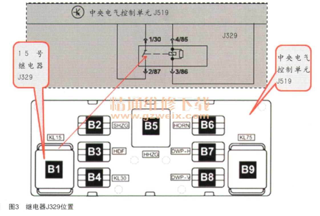 (3)15號繼電器J329故障(此車型該繼電器直接安裝在J519上,如圖3所示)。
