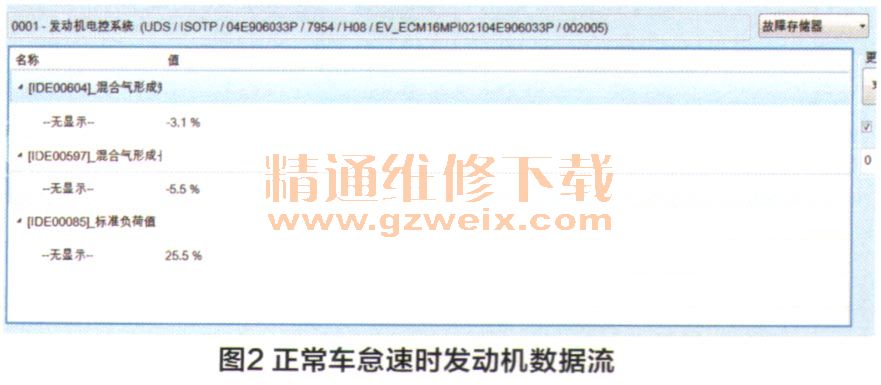 接車(chē)后,首先連接大眾專(zhuān)用診斷儀VAS6150,讀取發(fā)動(dòng)機(jī)故障碼P218700 ($3AB6/15030),其含義是:汽缸列1,燃油測(cè)量系統(tǒng),怠速時(shí)混合汽過(guò)稀。讀取故障車(chē)怠速時(shí)發(fā)動(dòng)機(jī)數(shù)據(jù)流(圖1)、短期燃油修正為23.4%,長(zhǎng)期燃油修正為21.1%,這兩個(gè)數(shù)據(jù)遠(yuǎn)遠(yuǎn)高于正常車(chē)數(shù)據(jù)(圖2)。正常情況下,改款車(chē)型怠速時(shí)長(zhǎng)期燃油修正和短期燃油修正范圍為-10%~+10%.