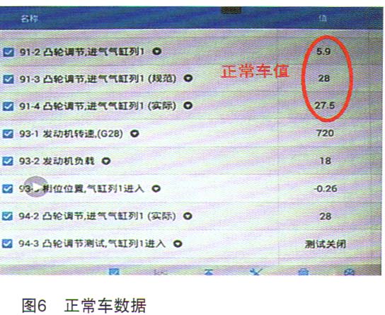 進(jìn)一步觀察數(shù)據(jù)發(fā)現(xiàn),凸輪軸調(diào)節(jié)數(shù)值高達(dá)87.5%,凸輪軸調(diào)節(jié)規(guī)范值-3,實(shí)際值26,仍然偏差很大。再找一臺(tái)正常車測試,二組數(shù)據(jù)對(duì)比,確定故障為調(diào)節(jié)閥執(zhí)行不力,如圖5和圖6所示。