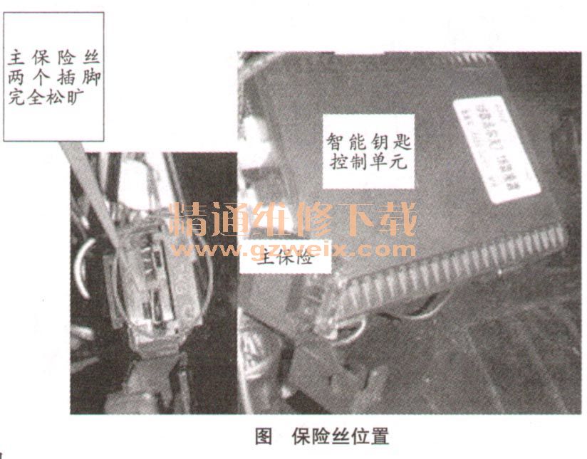 通過圖中可以看出,智能鑰匙控制單元的保險(xiǎn)絲插腳非常松曠,當(dāng)車輛啟動(dòng)時(shí),維修人員只需要輕輕晃動(dòng)該保險(xiǎn)絲座,車輛也會(huì)出現(xiàn)熄火的情況,熄火后無法馬上啟動(dòng),要稍等一下方可啟動(dòng)。完全吻合客戶所描述的故障現(xiàn)象了。
