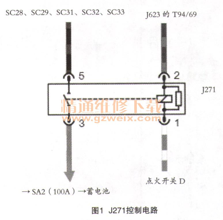 打開電路圖,對發(fā)動機主繼電器J271進行檢查(如圖1所示),可見J271為一個4腳普通繼電器,是典型的通過小電流控制大電流,達到保護開關或線路的目的。其1號腳為J271主線圈的正極控制線(由點火開關15號線供電經(jīng)過保險絲SC20到達1號腳),2號腳為J271控制線圈的回路線(該可控搭鐵由J623發(fā)動機控制單元94/69號腳控制)。一旦繼電器1號腳通電并經(jīng)過2號腳搭鐵構(gòu)成回路后繼電器磁場線圈產(chǎn)生磁場,在磁場的作用下繼電器觸點閉合接通繼電器的3號腳和5號腳,此時電流從蓄電池正極流出經(jīng)過SA2→繼電器3號腳→繼電器觸點→5號腳→SC28、SC29、SC31、SC33、SC32到達各個用電器。