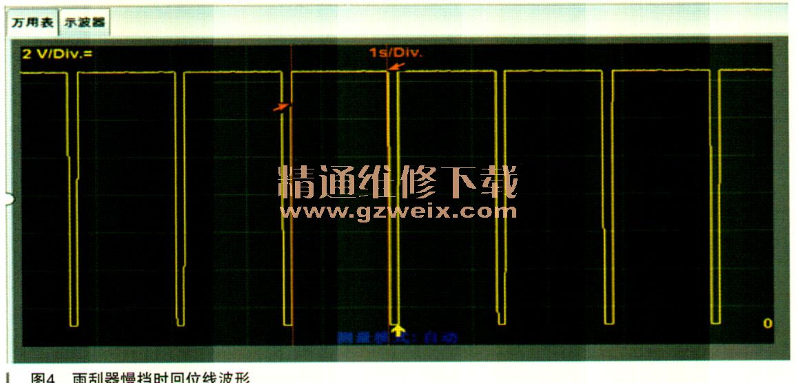電路圖中能夠看到J400的T4a/3至J519控制單元的T52b/20這條黑灰線(xiàn),是負(fù)責(zé)雨刮器回位的一條線(xiàn),它應(yīng)該是雨刮器電機(jī)向J519單元提供位置信號(hào),如果雨刮器停在正確位置,此線(xiàn)應(yīng)該是接地。為了能證明該線(xiàn)是否存在異常,用示波儀能明確看出工作狀況,如圖4-圖7所示。