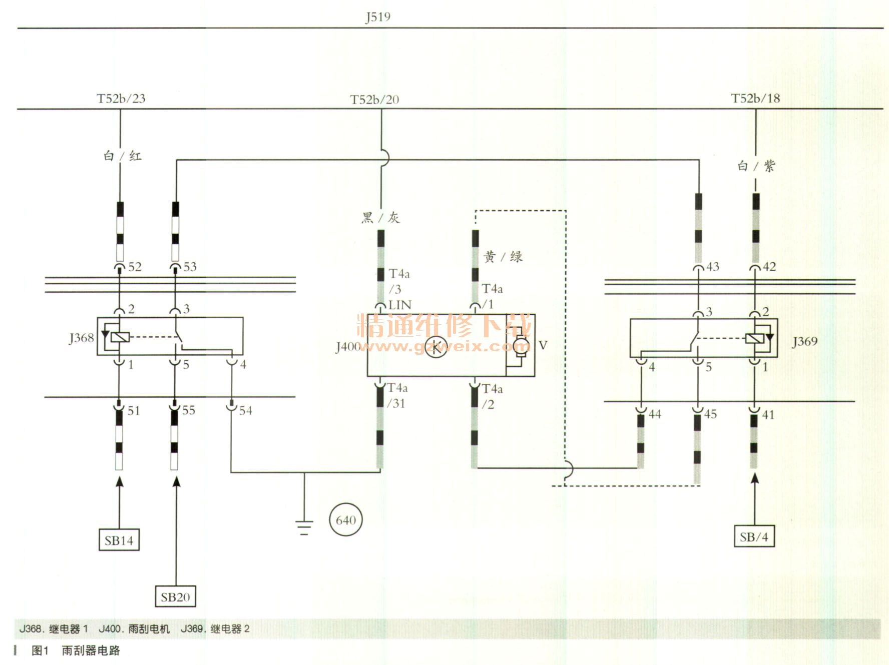 一輛行駛里程約4萬(wàn)km的大眾新帕薩特GP轎車(chē)。該車(chē)鑰匙打開(kāi)10min左右,雨刮器會(huì)自動(dòng)刮兩下。車(chē)輛在行駛過(guò)程中,也會(huì)有自動(dòng)刮的現(xiàn)象存在。