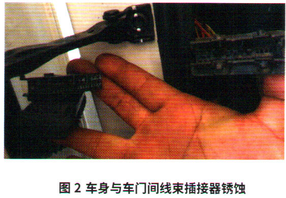 繼續(xù)檢查車(chē)身到車(chē)門(mén)的線(xiàn)束,當(dāng)拔下車(chē)身和車(chē)門(mén)之間的線(xiàn)束插接器時(shí),發(fā)現(xiàn)插接器已經(jīng)腐蝕(圖2)。處理好腐蝕的插接器,插接后無(wú)論怎樣晃動(dòng)線(xiàn)束,均沒(méi)有故障碼出現(xiàn),安全氣囊故障燈也不再點(diǎn)亮。看來(lái)故障就是因插接器腐蝕引起的。正常情況下,該插接器是不容易進(jìn)水引起腐蝕的,判斷是因?yàn)樵诩友b360影像時(shí),因需要從該插接器引線(xiàn)沒(méi)有處理好,導(dǎo)致插接器進(jìn)水腐蝕。