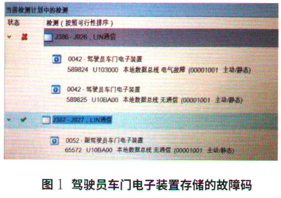 用故障診斷儀對(duì)車(chē)輛檢測(cè),在15一安全氣囊控制單元存儲(chǔ)故障碼:B101715—駕駛員側(cè)側(cè)面安全氣囊碰撞傳感器斷路/對(duì)正極短路,主動(dòng)/靜態(tài)”;在42一駕駛員側(cè)車(chē)門(mén)控制單元中存儲(chǔ)2個(gè)故障碼:U103000本地?cái)?shù)據(jù)總線(xiàn)電氣故障,主動(dòng)/靜態(tài);U10BA00—本地?cái)?shù)據(jù)總線(xiàn)無(wú)通訊,主動(dòng)/靜態(tài);在52一前排乘客側(cè)車(chē)門(mén)控制單元中存儲(chǔ)1個(gè)故障碼:U10BA00本地?cái)?shù)據(jù)總線(xiàn)無(wú)通訊,主動(dòng)/靜態(tài)(圖1)。故障碼都無(wú)法清除。