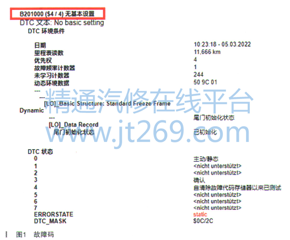 首先連接故障診斷儀VAS615OX進(jìn)行檢測(cè),可見(jiàn)006D-后備箱電子裝置存儲(chǔ)有故障碼:B201000無(wú)基本設(shè)置(如圖1所示)。