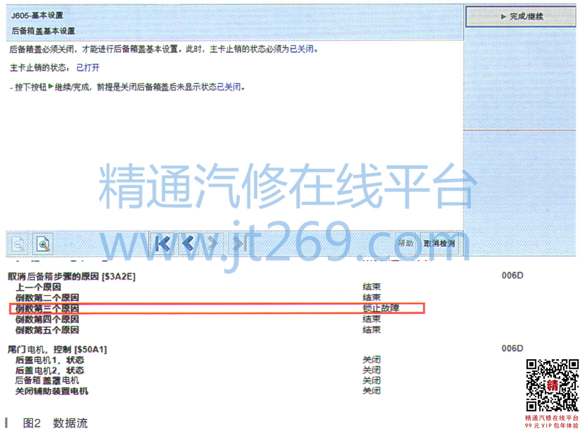 數(shù)據(jù)流,記憶中斷后備箱蓋基本設(shè)置步驟的原因,其中取消后備箱蓋步驟的倒數(shù)第三個(gè)原因?yàn)殒i止故障(如圖2所示),由此可見(jiàn)目前主卡止銷(xiāo)狀態(tài)鎖止故障才是基本設(shè)置失敗的癥結(jié)所在。
