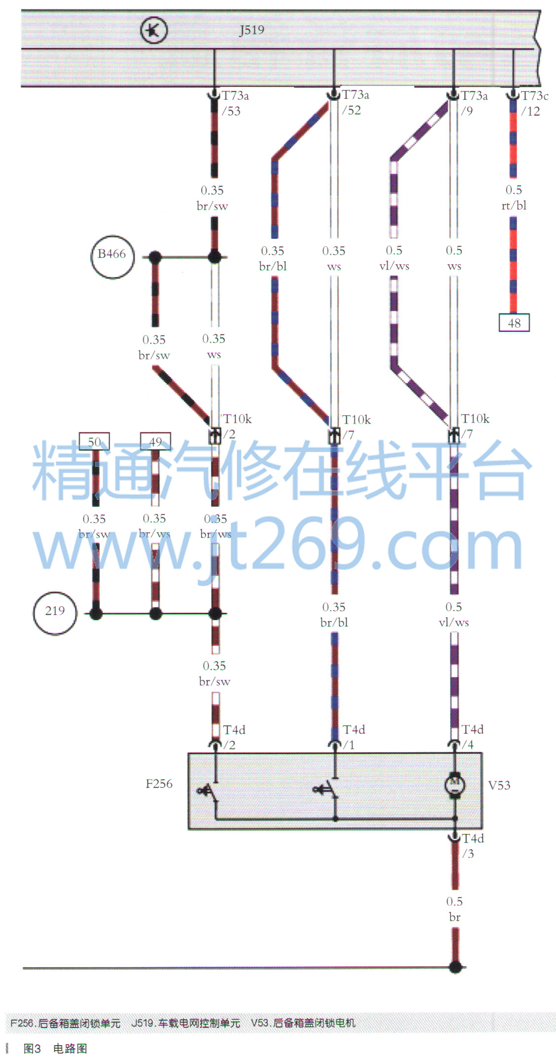 根據(jù)筆者理解,主卡止銷(xiāo)應(yīng)該在后備箱鎖塊上面。在動(dòng)手排除故障之前,有必要先弄清楚鎖塊及后備箱控制模塊之間的聯(lián)系,通過(guò)ELSAPRO查看該車(chē)后備箱蓋工作的部件:后備箱蓋控制單元J605直接控制后備箱蓋左右側(cè)兩個(gè)電機(jī)V444和V445工作,電機(jī)通過(guò)正反轉(zhuǎn)來(lái)打開(kāi)或關(guān)閉后備箱蓋,同時(shí)左右側(cè)電機(jī)V444和V445里面集成了后備箱蓋的高度傳感器G745和G746 、通過(guò)這兩個(gè)傳感器檢測(cè)后備箱的開(kāi)啟高度,另外還有后備箱蓋關(guān)閉輔助功能VX16電機(jī),以及后備箱鎖閉按鈕E574的信號(hào)均是直接和J605相連接,其他還有J605的供電接地線、通信CAN線以及后備箱運(yùn)行過(guò)程中警報(bào)蜂鳴器H32之外,后備箱蓋控制單元沒(méi)有其他的部件了。由此可見(jiàn)后備箱鎖塊并沒(méi)有直接和J605連接,繼續(xù)查看電路圖發(fā)現(xiàn),后備箱蓋閉鎖單元F256共四根線,除開(kāi)一根搭鐵線之外,另外三根線直接連接至J519,同時(shí)電路圖上可見(jiàn)F256有兩個(gè)開(kāi)關(guān),一個(gè)電機(jī)(如圖3所示),雖然圖上沒(méi)標(biāo)注這兩個(gè)開(kāi)關(guān)的作用,但是筆者認(rèn)為主卡止銷(xiāo)的位置信號(hào)應(yīng)該就是這兩個(gè)開(kāi)關(guān)所提供的,只是F256開(kāi)關(guān)信號(hào)通過(guò)硬線給J519之后,J519再通過(guò)CAN線傳遞給J605。