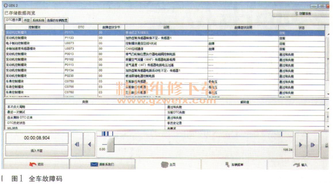 故障診斷:首先確認故障現(xiàn)象,發(fā)現(xiàn)著車后怠速就不穩(wěn)定起來,明顯 抖動,運轉(zhuǎn)1inin左右就會熄火。若加速的話發(fā)動機轉(zhuǎn)速提升,無明顯的異常。用GDS2讀取全車故障碼( 圖1所示),有故障碼P0171燃油修正系統(tǒng)貧化;P1133加熱型氧傳感器轉(zhuǎn)換不足,傳感器1。電子制動控制模塊和多軸加速度傳感器控制模塊均有U0073控制模塊通信總線A關閉故障碼。