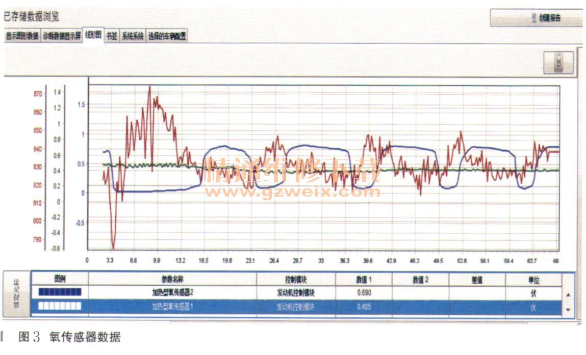 消碼后著車讀取發(fā)動機控制模塊的燃油修止相關數(shù)據(jù)流發(fā)現(xiàn)短期燃油修正存在偏稀的情況,短期燃油值在-1%~18%之間波動,而長期燃油調(diào)整值-19%~6%之間(如圖2所示)。讀取氧傳感器數(shù)據(jù)流,氧傳感器1電壓在0.53V左右?guī)缀鯖]有波動(如圖3所示),明顯存在問題。