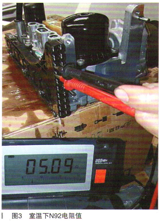 拆下機(jī)電控制單元,測(cè)量N92到J217之間的線路和N92電磁閥的電阻值(如圖3所示)。經(jīng)檢查N92阻值為5.09Ω,在正常范圍之內(nèi)。檢查N92到殼體的阻值為無窮大(如圖4所示),診斷儀提示需更換變速器控制單元J217。更換變速器控制單元J217后故障排除。