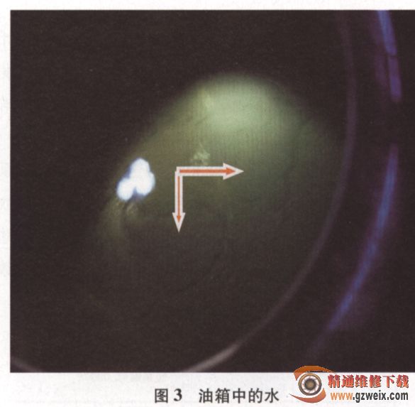 接車后,首先確認(rèn)故障現(xiàn)象,經(jīng)試車故障屬實(shí)。檢測(cè)故障代碼,有歷史故障代碼P0301和P0304,含義是1缸和4缸失火。維修技術(shù)人員檢查怠速電動(dòng)機(jī),發(fā)現(xiàn)有卡滯現(xiàn)象,更換怠速電動(dòng)機(jī)后,再次清洗發(fā)動(dòng)機(jī)積炭,路試,行駛中熄火現(xiàn)象消失,但減速后發(fā)動(dòng)機(jī)抖動(dòng)故障仍然存在。于是,更換高壓線、火花塞和點(diǎn)火線圈,故障依舊;檢測(cè)燃油壓力,在發(fā)動(dòng)機(jī)抖動(dòng)時(shí)油壓表無(wú)反應(yīng),說(shuō)明該故障與燃油壓力無(wú)關(guān);導(dǎo)致發(fā)動(dòng)機(jī)怠速抖動(dòng)的原因很多,最有可能的原因應(yīng)該是進(jìn)氣系統(tǒng)和EGR閥漏氣,斷開(kāi)EVAP電磁閥和EGR電磁閥導(dǎo)線連接器后試車,故障現(xiàn)象沒(méi)有改變,說(shuō)明故障與EVAP和EGR電磁閥無(wú)關(guān);試著更換氧傳感器,故障仍然沒(méi)有好轉(zhuǎn)。于是,用手持真空表測(cè)量進(jìn)氣歧管真空度,怠速時(shí)進(jìn)氣歧管真空度為72 kPa,真空表指針擺動(dòng)幅度約為4 kPa,基本正常,發(fā)動(dòng)機(jī)抖動(dòng)時(shí)進(jìn)氣歧管真空度在68 kPa,真空表表針擺動(dòng)幅度較大;對(duì)氣缸壓力和漏氣率進(jìn)行測(cè)量,沒(méi)發(fā)現(xiàn)任何問(wèn)題。故障診斷至此有點(diǎn)迷茫了,還有什么會(huì)導(dǎo)致減速后怠速抖動(dòng)呢?長(zhǎng)、短期燃油調(diào)整值正常,真空也不漏氣,點(diǎn)火、正時(shí)、氣缸壓力都正常。詢問(wèn)車主燃油使用情況,車主表示均是在正規(guī)加油站加的油,燃油肯定沒(méi)有問(wèn)題。經(jīng)過(guò)分析,決定拆卸燃油泵檢查回油流量,拆卸燃油泵后發(fā)現(xiàn)油箱內(nèi)有較多的水(圖3)。