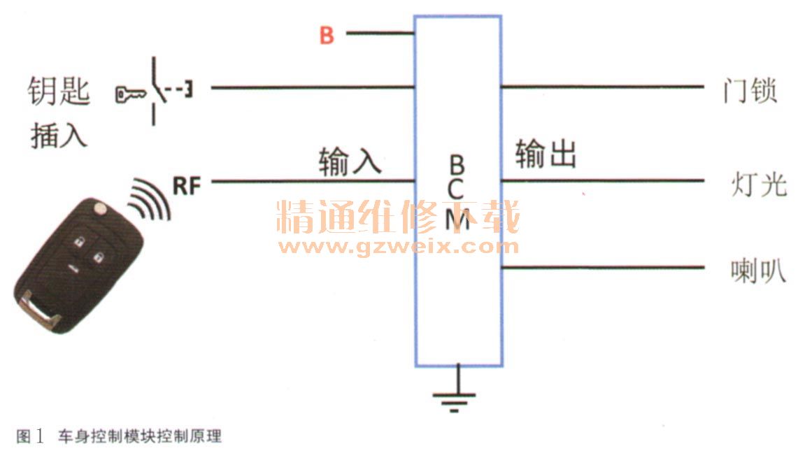 故障診斷:此車不帶無鑰匙啟動和無鑰匙進入系統(tǒng)(RPO代碼ATH ),只裝配了普通的遙控門鎖系統(tǒng),遙控門鎖系統(tǒng)有以下部件:遙控門鎖發(fā)射器和車身控制模塊BCMO系統(tǒng)工作原理如圖1所示。
