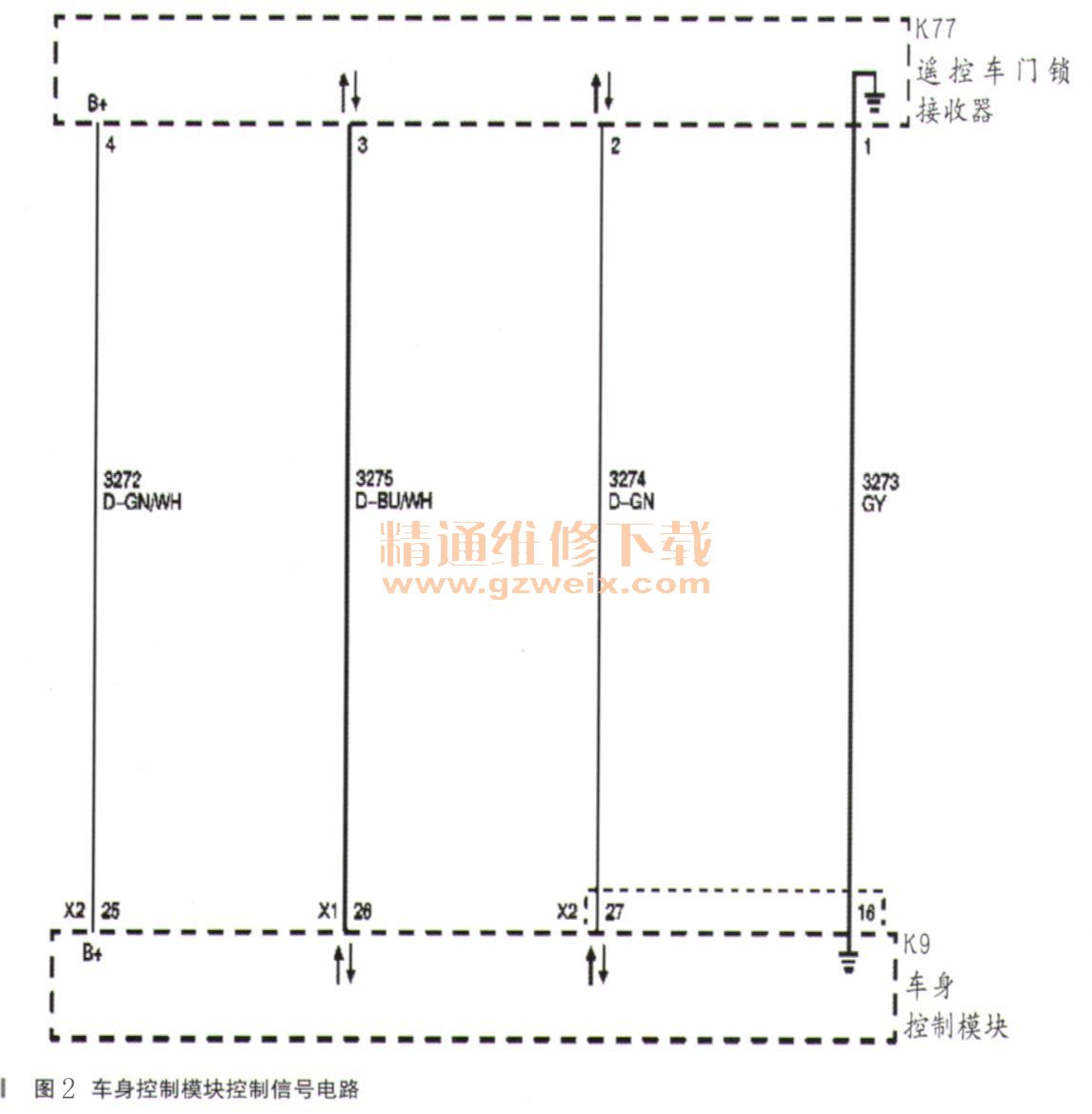 當遙控門鎖發(fā)射器上相應(yīng)的按鈕按下時,發(fā)射器發(fā)出無線電信號,位于內(nèi)后視鏡座內(nèi)的遙控車門鎖接收器(RFA)(代號K77)接收該信號,通過兩根信號線傳遞給車身控制模塊(如圖2所示),車身控制模塊(代號K9)解釋該信號,并執(zhí)行所請求的功能。