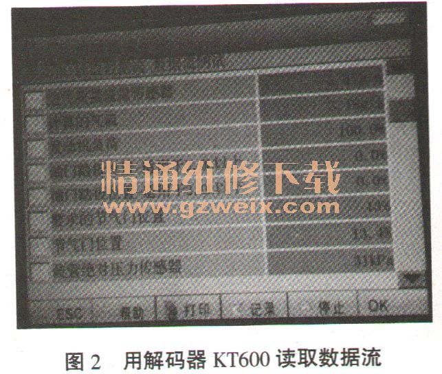 故障分析:檢查外觀后,為了更快速和準(zhǔn)確的排除故障,我們用解碼器KT600讀取了數(shù)據(jù)流,如圖2所示。