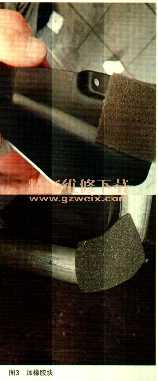 于是多管齊下,包扎管道、加橡膠塊、墊蒸發(fā)箱(如圖3所示),聲音終于消失。但行駛3個月車主再次打電話抱怨聲音重現(xiàn)。