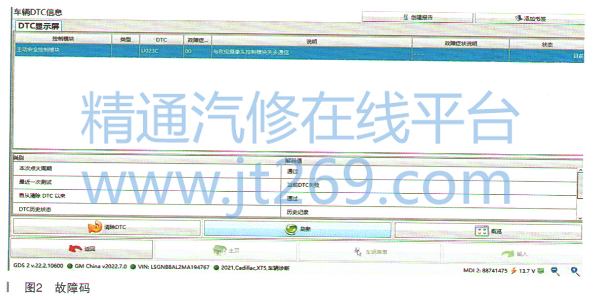 將診斷儀(GDS)與車輛連接,讀取全車故障碼,存在故障碼:U023C與夜視攝像頭模塊失去通信(目前),如圖2所示。