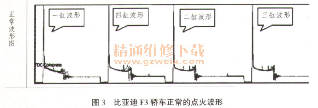 檢查分析:連接金德KT600故障診斷儀觀察數(shù)據(jù)流,設備顯示進氣歧管進氣壓力、噴油壓力和時間、點火提前角等,并參照了金德KT600比亞迪F3轎車維修手冊的標準(如圖1a、圖1b、圖1c所示),顯示數(shù)據(jù)都在正常范圍內;但測量點火波形時發(fā)現(xiàn)點火的峰值有異常,2~3缸的點火峰值波形明顯比1~4缸峰值波形低(圖3所示為比亞迪F3轎車正常的點火波形,圖2所示為比亞迪F3轎車異常的點火波形)。
