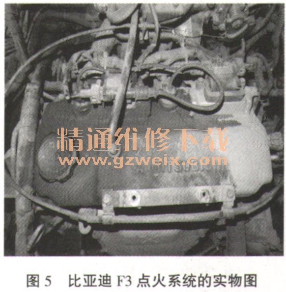 根據(jù)比亞迪F3點火系統(tǒng)的工作原理(如圖4所示):是屬于二極管分配方式無分電器同時點火方式,2個氣缸共用1個點火線圈,其次級線圈的兩端分別與2個氣缸火花塞相連,當一個氣缸處在壓縮上止點時,另一個氣缸處于排氣上止點,曲軸轉360°后2個缸所處的行程相反;1個點火線圈上有2個火花塞串聯(lián)同時點火。故決定檢查2~3缸的點火器或高壓分火線是否有故障,在2~3缸的高壓分火線上分別安裝2個新的火花塞,然后在發(fā)動機上搭鐵,觀察火花塞的跳火情況,當起動機帶動發(fā)動機旋轉時,立即發(fā)現(xiàn)跳火為紅色;而檢查1~4缸時火花塞的跳火為純藍色并帶有清脆的“啪啪”響,通過對比確定2~3缸的點火器或高壓分火線有故障。圖5為比亞迪F3點火系統(tǒng)的實物圖。