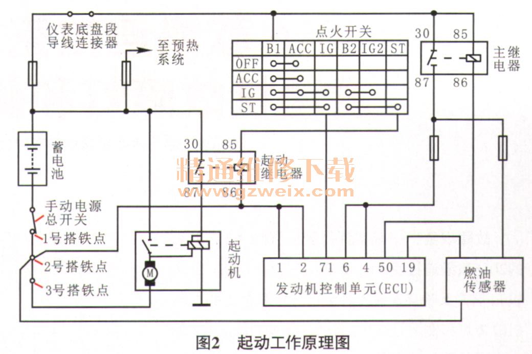 回廠后,用萬用表測量靜態(tài)時(shí)蓄電池的電壓,為13.5V,正常;測量啟動(dòng)時(shí)蓄電池的電壓,為11V,正常。將萬用表紅色表筆連接蓄電池正極,黑色表筆連接在發(fā)動(dòng)機(jī)搭鐵點(diǎn),啟動(dòng)時(shí)測得的電壓為8.9V,終于明白之前為何ECU存儲(chǔ)蓄電池電壓過低的故障代碼了。根據(jù)以往的維修經(jīng)驗(yàn),ECU電源低于9V就會(huì)存儲(chǔ)蓄電池電壓過低的故障代碼。為何搭鐵位置不同測得的啟動(dòng)電壓也不同,并且相差2.1V?帶著這個(gè)疑問,維修人員對發(fā)動(dòng)機(jī)室和駕駛室進(jìn)行仔細(xì)檢查,該車是用來運(yùn)輸危險(xiǎn)品的,為了安全考慮,在蓄電池旁加裝了控制蓄電池負(fù)極斷開的手動(dòng)電源總開關(guān)。查閱相關(guān)資料,結(jié)合該車實(shí)際布線情況,畫出其啟動(dòng)工作原理圖(圖2),1號(hào)搭鐵點(diǎn)為蓄電池箱搭鐵點(diǎn),2號(hào)搭鐵點(diǎn)為車架搭鐵點(diǎn),3號(hào)搭鐵點(diǎn)為發(fā)動(dòng)機(jī)搭鐵點(diǎn)。啟動(dòng)時(shí),測量蓄電池負(fù)極與1號(hào)搭鐵點(diǎn)間的電壓,為1V,存在接觸不良現(xiàn)象;測量1號(hào)搭鐵點(diǎn)和3搭鐵點(diǎn)間的電壓,為0.8V,也存在接觸不良現(xiàn)象。更換手動(dòng)電源總開關(guān),把連接2號(hào)搭鐵點(diǎn)的發(fā)動(dòng)機(jī)搭鐵過橋線直接連接到1號(hào)搭鐵點(diǎn)上;啟動(dòng)發(fā)動(dòng)機(jī),啟動(dòng)機(jī)運(yùn)轉(zhuǎn)更加有力,發(fā)動(dòng)機(jī)也更容易啟動(dòng);測量蓄電池負(fù)極與發(fā)動(dòng)機(jī)搭鐵間的電壓,只有0.2V,正常,但發(fā)動(dòng)機(jī)故障燈、SVS故障燈有時(shí)候還會(huì)點(diǎn)亮,且讀取到得的故障代碼仍為P161F和P150B。啟動(dòng)時(shí),讀取發(fā)動(dòng)機(jī)相關(guān)數(shù)據(jù)流,ECU電源電壓為9.5V,正常。懷疑ECU故障,誤存儲(chǔ)故障代碼,但又找不到同型號(hào)車輛的ECU進(jìn)行互換測試,此時(shí)故障診斷陷入僵局。