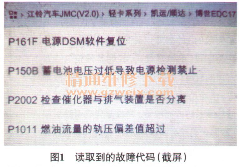 一輛行駛里程約4.3萬km、搭載JX493ZLQ4發(fā)動(dòng)機(jī),并配備博世EDC17電控系統(tǒng)的2015年江鈴順達(dá)。車主反映:該車早上發(fā)動(dòng)機(jī)難啟動(dòng),需要啟動(dòng)兩三次才能啟動(dòng)著機(jī);車輛行駛過程中,發(fā)動(dòng)機(jī)經(jīng)常會(huì)自動(dòng)熄火,重新啟動(dòng)發(fā)動(dòng)機(jī),發(fā)動(dòng)機(jī)能夠勉強(qiáng)啟動(dòng),此時(shí)發(fā)動(dòng)機(jī)加速無力,組合儀表上發(fā)動(dòng)機(jī)故障燈和SVS故障燈有時(shí)會(huì)點(diǎn)亮。