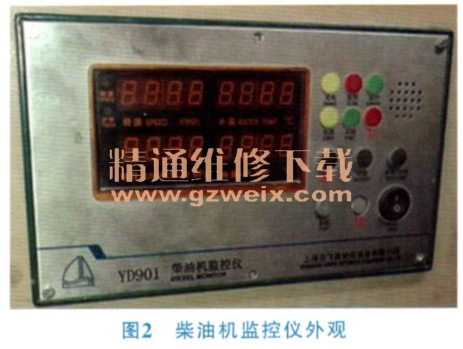 該機(jī)組配備YD901型柴油機(jī)監(jiān)控儀,此監(jiān)控儀可對(duì)柴油機(jī)的轉(zhuǎn)速、水溫、油壓、油溫等信號(hào)實(shí)時(shí)監(jiān)測(cè),通過監(jiān)控儀可對(duì)柴油機(jī)進(jìn)行啟停和預(yù)熱等操作,其安裝于電控箱外部面板,通過線束與電控箱內(nèi)部連接。柴油機(jī)監(jiān)控儀外觀見圖2。