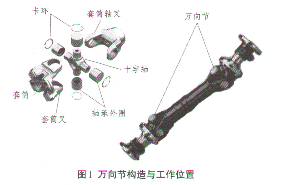 萬向節(jié)(Universal Joint)即萬向接頭,是實現(xiàn)變角度動力傳遞的機件,用于需要改變傳動軸線方向的位置,是汽車驅(qū)動系統(tǒng)的萬向傳動裝置的“關節(jié)”部件,其在實現(xiàn)角度變化的同時傳遞扭矩,具備結(jié)構(gòu)簡單、低幅磨碎少、傳遞效率高等特點。其構(gòu)造如圖1所示,分別為:十字軸、套筒、套筒叉、軸承外圈、卡環(huán)、傳動軸叉。