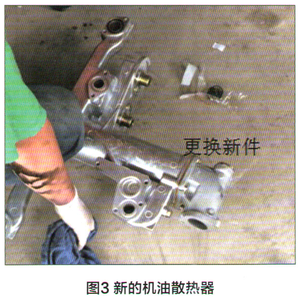 該車(chē)之前更換了許多零部件,但卻沒(méi)有檢查機(jī)油散熱器,如果水泵的水無(wú)法完全從機(jī)油散熱器處循環(huán)到缸體,肯定會(huì)導(dǎo)致發(fā)動(dòng)機(jī)水溫高的故障。拆下機(jī)油散熱器底部水管,果然發(fā)現(xiàn)下面很多蜂窩孔已經(jīng)被堵塞(圖2),由于堵塞嚴(yán)重只好更換新的機(jī)油散熱器(圖3)。拆下舊件換上新件后外出路試,發(fā)動(dòng)機(jī)未再出現(xiàn)水溫高的故障,該車(chē)故障被徹底排除。