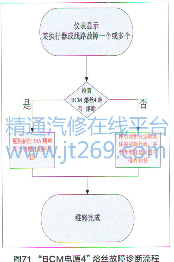 BCM電源4”熔絲出現(xiàn)故障時,應(yīng)按照圖71所示流程進行排查。