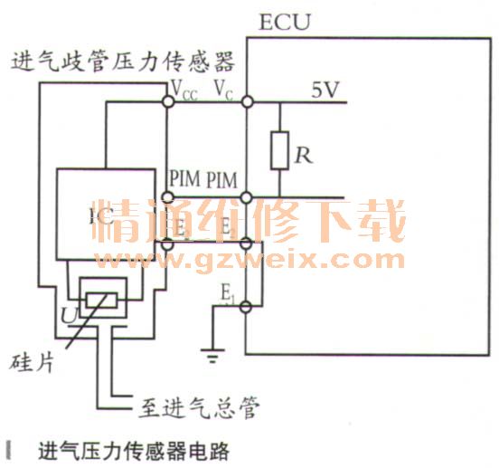 一輛豐田佳美進(jìn)廠(chǎng)檢修,報(bào)修項(xiàng)目為怠速不穩(wěn),加速不良,排氣管冒黑煙,聽(tīng)車(chē)主介紹該車(chē)故障已持續(xù)一段時(shí)間了。接車(chē)后,對(duì)故障進(jìn)行確認(rèn),發(fā)動(dòng)機(jī)確有怠速不穩(wěn)故障,該車(chē)采用豐田5S-FE型發(fā)動(dòng)機(jī),由于發(fā)動(dòng)機(jī)冒黑煙,因此,可以判定為混合氣過(guò)濃所致。拆下火花塞檢查,火花塞兩電極已變黑,仔細(xì)分析,造成混合氣過(guò)濃的原因一般都是燃油壓力過(guò)高或測(cè)量進(jìn)氣量的傳感器失效所致。先測(cè)量燃油壓力,接上壓力表,著車(chē),怠速時(shí)燃油表指示壓力為0.3MPa左右,燃油壓力止常,由此推測(cè),應(yīng)該是測(cè)量進(jìn)氣量的傳感器出現(xiàn)了故障導(dǎo)致噴油量過(guò)大。該發(fā)動(dòng)機(jī)是利用進(jìn)氣壓力傳感器來(lái)測(cè)量進(jìn)氣的,發(fā)動(dòng)機(jī)ECU根據(jù)進(jìn)氣量的多少及發(fā)動(dòng)機(jī)轉(zhuǎn)速控制基本噴油量。進(jìn)氣壓力傳感器安裝在發(fā)動(dòng)機(jī)艙后壁,進(jìn)氣壓力傳感器主要由電硅膜片真空室、集成電路和線(xiàn)束及插座等組成,如圖所示。