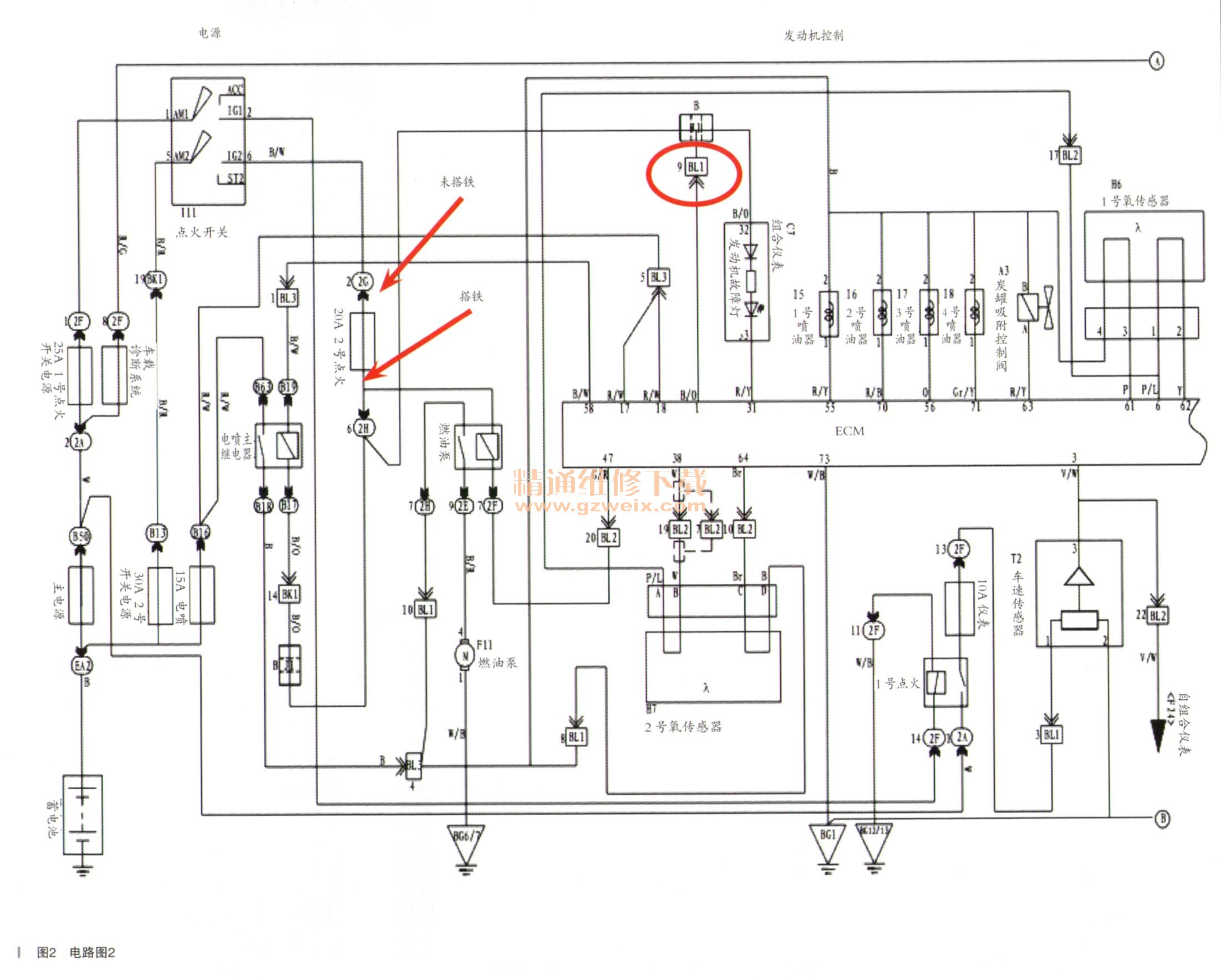 查看維修手冊,找相關(guān)電路圖,熔斷的保金絲為2號點火保險絲,如圖1所示。