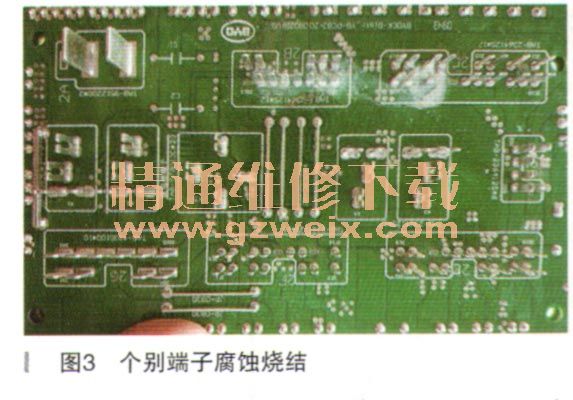 由于 2號點火保險絲與燃油泵繼電器的電路是集成在配電盒上的,因此我們對配電盒進(jìn)行分解檢查,發(fā)現(xiàn)有個別端子腐蝕燒結(jié)(如圖3所示),對其清潔處理后裝車試車,結(jié)果依然還是對地短路。