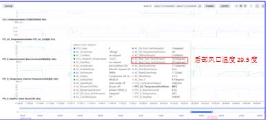2.通過測(cè)量后排出風(fēng)口溫度,溫度由冷變熱,懷疑是不是后排空調(diào)冷熱風(fēng)門電機(jī)卡滯再中間位置,用診斷儀動(dòng)作測(cè)試,冷熱溫度控制面板是可以正常控制,遂與正常車倒換后排空調(diào)控制面板測(cè)試,故障現(xiàn)象依舊。3、區(qū)域技術(shù)后臺(tái)VHR分析:PTC R HEAT 一直加熱有功率輸出。