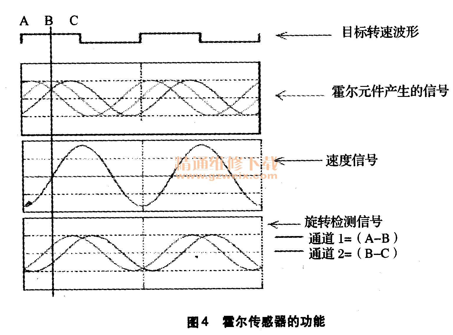 差分霍爾傳感器信號(hào),通道1和2是檢測(cè)旋轉(zhuǎn)方向的必要條件,通道1=轉(zhuǎn)速通道(A-B);通道2=旋轉(zhuǎn)方向通道(B-C)。