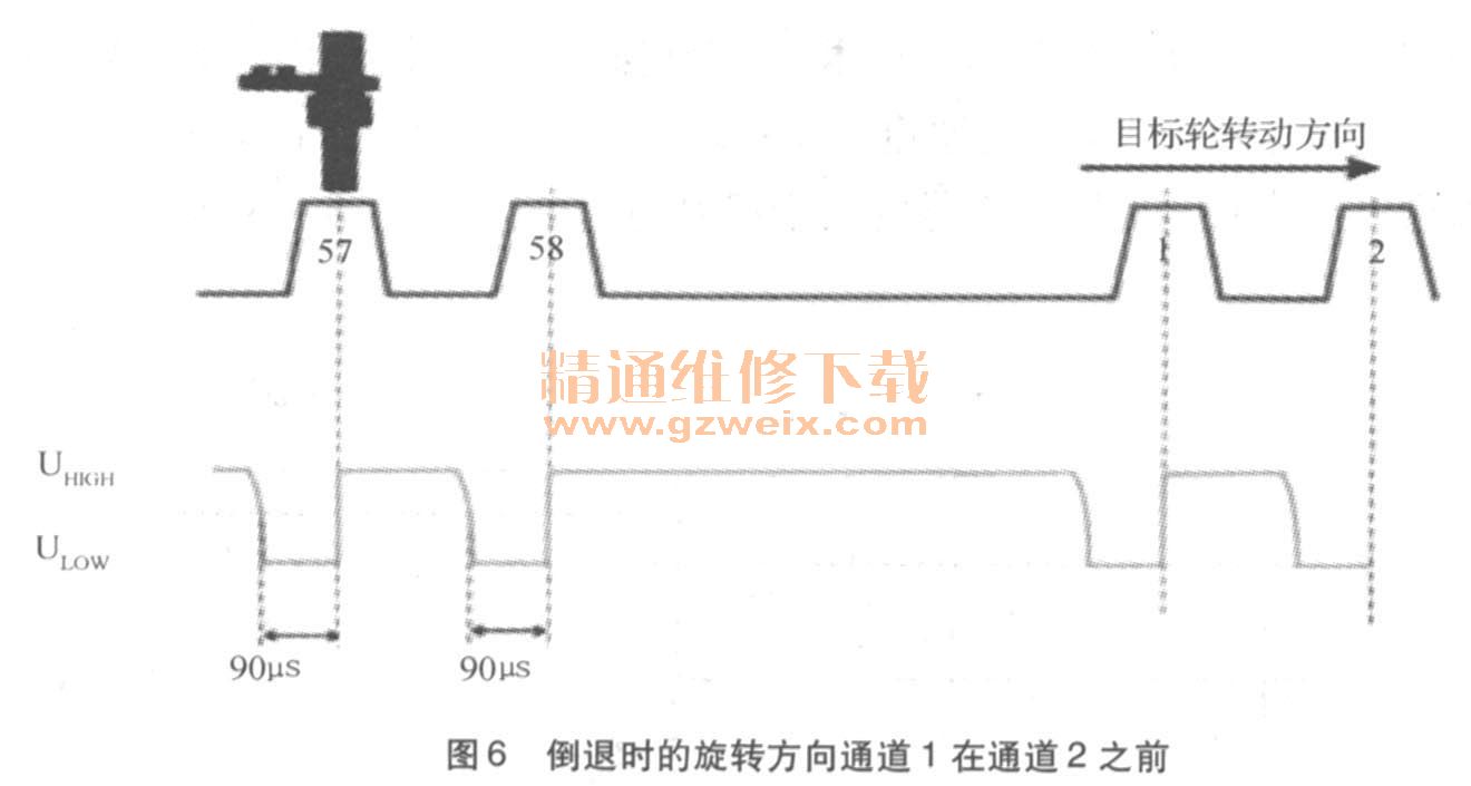 當(dāng)轉(zhuǎn)速通道超過(guò)0刻度線時(shí),傳感器會(huì)切換到“低速”。輪齒中心和信號(hào)下降邊緣之間的偏移是一個(gè)常數(shù),可以在DME軟件中進(jìn)行調(diào)整。旋轉(zhuǎn)方向的檢測(cè)以轉(zhuǎn)速通道和旋轉(zhuǎn)方向通道之間的相位移為基礎(chǔ)(如圖5、圖6所示)。