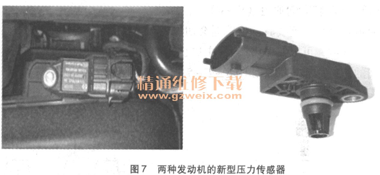 壓力傳感器:安裝在進(jìn)氣歧管的后方(如圖7所示),以前2個(gè)熱膜式空氣流量傳感器安裝在空氣濾清器殼和電子節(jié)氣門之間),進(jìn)氣歧管上的新型壓力傳感器取代了此前的熱膜式空氣流量(MAF )傳感器(壓力傳感器取代了2個(gè)MAF傳感器)。為了確保燃燒室內(nèi)始終有正確比例的混合氣體,車輛使用測(cè)量空氣流量的壓力傳感器持續(xù)地測(cè)量實(shí)際進(jìn)氣質(zhì)量。因此,燃燒室內(nèi)始終存在正確比例的混合氣體,并補(bǔ)償(因海拔高度變化導(dǎo)致的)任何大氣壓和車外溫度變化。這種新的壓力傳感器取代了此前使用的熱膜式空氣流量測(cè)量系統(tǒng),它還能消除進(jìn)氣部分的氣流阻礙,從而提高性能。