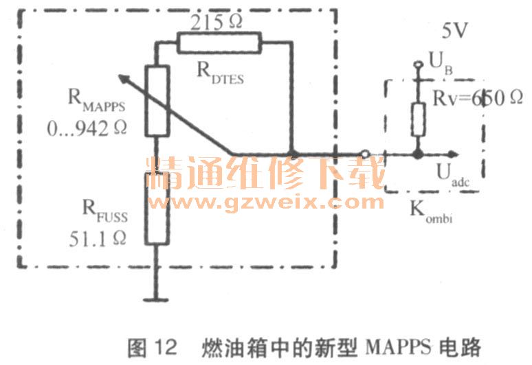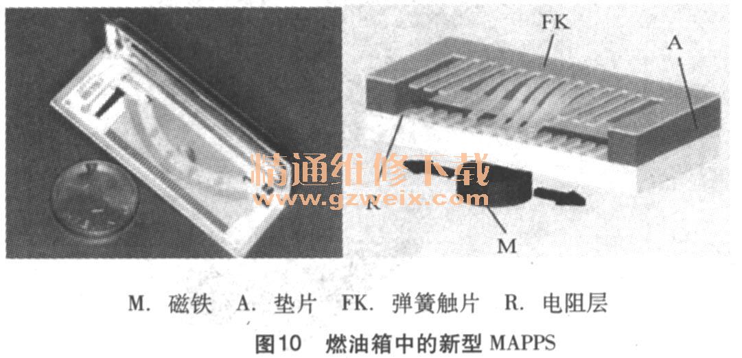 燃油箱中安裝了3個(gè)新型MAPPS(如圖10所示)燃油油位傳感器,用于測(cè)量燃油油位。在這些傳感器中,52個(gè)串聯(lián)的薄膜電阻器(R)都用單分接頭連接到陶瓷載體上。在載體不遠(yuǎn)處有一個(gè)磁性軟膜,上面有相同數(shù)量的彈簧觸片。各個(gè)彈簧觸片(FK)均被陶瓷載體下方的磁鐵(M)拉向分接頭。