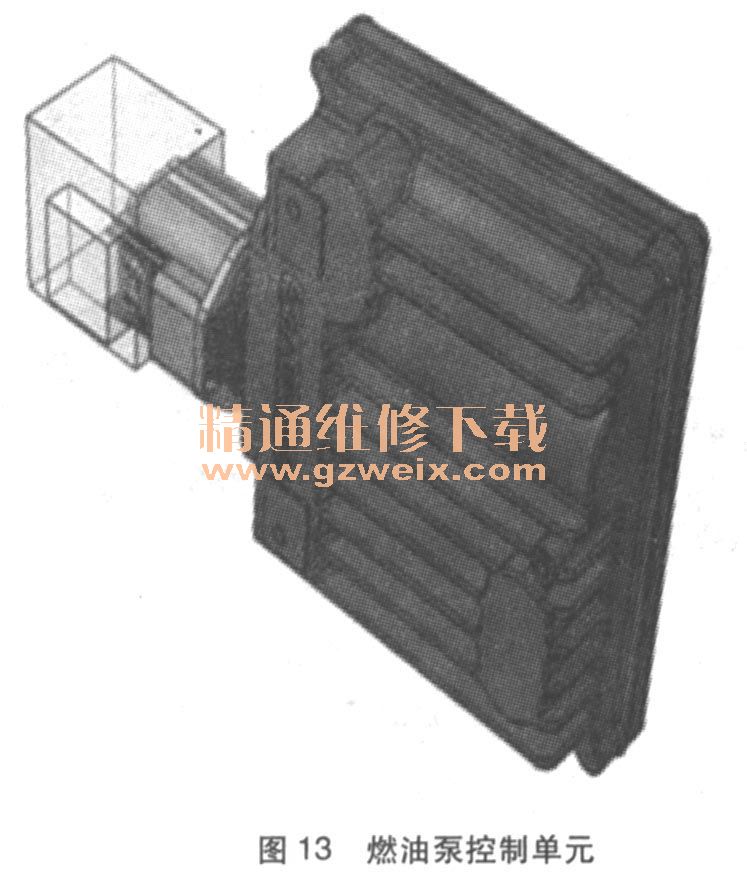 燃油泵控制單元(如圖13所示)功能原理:燃油泵控制單元安裝在燃油箱前端的右側(cè),負(fù)責(zé)無(wú)級(jí)控制電動(dòng)燃油泵。此控制單元通過(guò)雙向脈寬調(diào)制接口從DME控制單元接收燃油泵的設(shè)定點(diǎn)速度,并發(fā)回診斷信息。