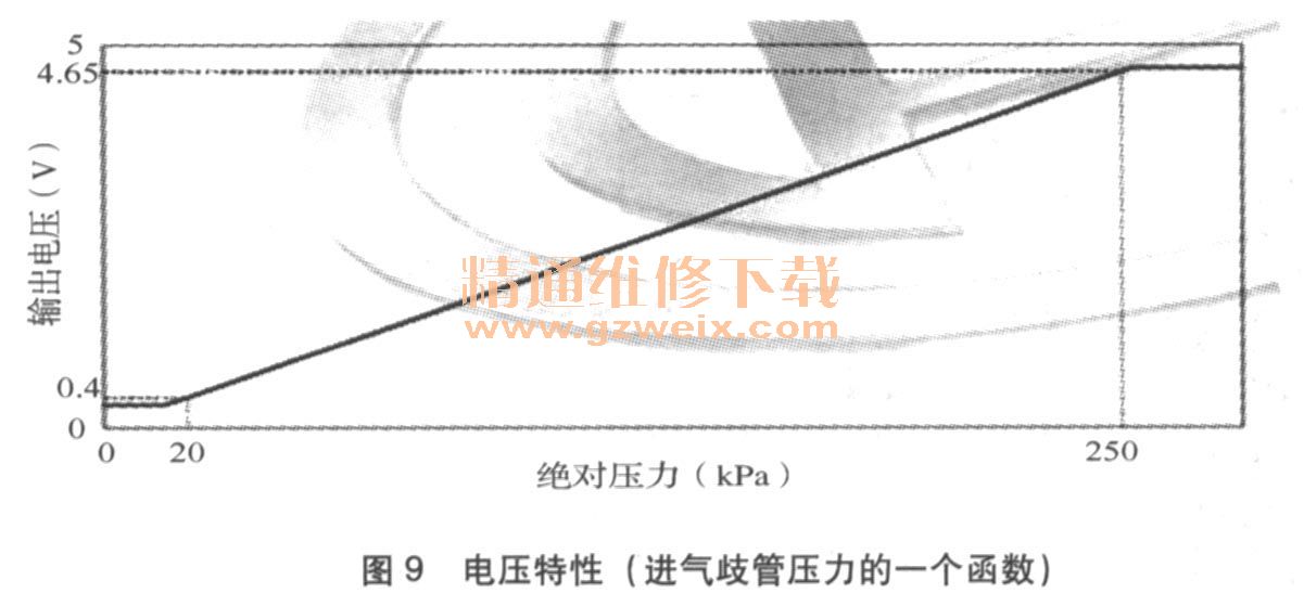 壓力傳感器剖面圖,(如圖8所示);壓力傳感器的電壓特性(進(jìn)氣歧管壓力的一個(gè)函數(shù)),如圖9所示。
