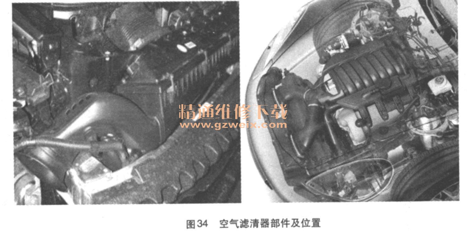 由于空氣濾清器殼位于前裙板后面(如圖34所示),要更換空氣濾清器濾芯就必須拆下前裙板。特定于國家/地區(qū)的保養(yǎng)計(jì)劃表中指定了保養(yǎng)間隔。在自然進(jìn)氣發(fā)動機(jī)上,從空氣濾清器殼通出的2根空氣管道在電子節(jié)氣門前面交會。