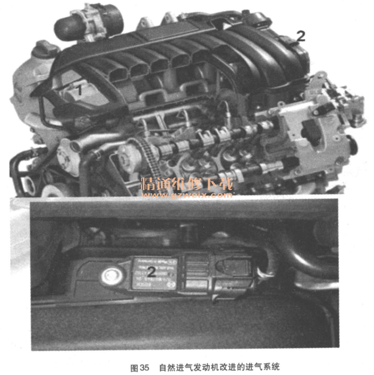 自然進(jìn)氣發(fā)動機(jī)的改進(jìn)的進(jìn)氣系統(tǒng)(圖35所示),和卡宴GTS一樣,帕拉梅拉S配備了一個節(jié)氣門(1),直徑是82mm(卡宴S 76mm),經(jīng)過改進(jìn)的進(jìn)氣系統(tǒng)及壓力傳感器固定架(2)。具有可變進(jìn)氣歧管的進(jìn)氣系統(tǒng)既有長進(jìn)氣歧管的優(yōu)勢(低轉(zhuǎn)速時獲得較高扭矩),又有短進(jìn)氣歧管的優(yōu)勢:在較高轉(zhuǎn)速范圍內(nèi)獲得高單位輸出功率。為此,諧振進(jìn)氣系統(tǒng)在進(jìn)氣管中使用取決于發(fā)動機(jī)轉(zhuǎn)速的空氣質(zhì)量振動,以提高發(fā)動機(jī)的單位工作容積效率。根據(jù)進(jìn)氣歧管活門的位置,此措施可實(shí)現(xiàn)高扭矩曲線,并優(yōu)化進(jìn)氣管幾何結(jié)構(gòu)。DME控制單元控制一個可將真空轉(zhuǎn)換到膜片電池的電控氣動轉(zhuǎn)換閥,以在低發(fā)動機(jī)轉(zhuǎn)速下切換到長進(jìn)氣歧管長度。從發(fā)動機(jī)轉(zhuǎn)速達(dá)到中等范圍時開始,就會切換到短進(jìn)氣歧管。源自卡宴的經(jīng)過驗(yàn)證的生產(chǎn)工藝使得用塑料制造多件式進(jìn)氣系統(tǒng)成為可能,這樣能盡量減重。新進(jìn)氣歧管在背面有一個用于檢測載荷的新壓力傳感器的固定架。