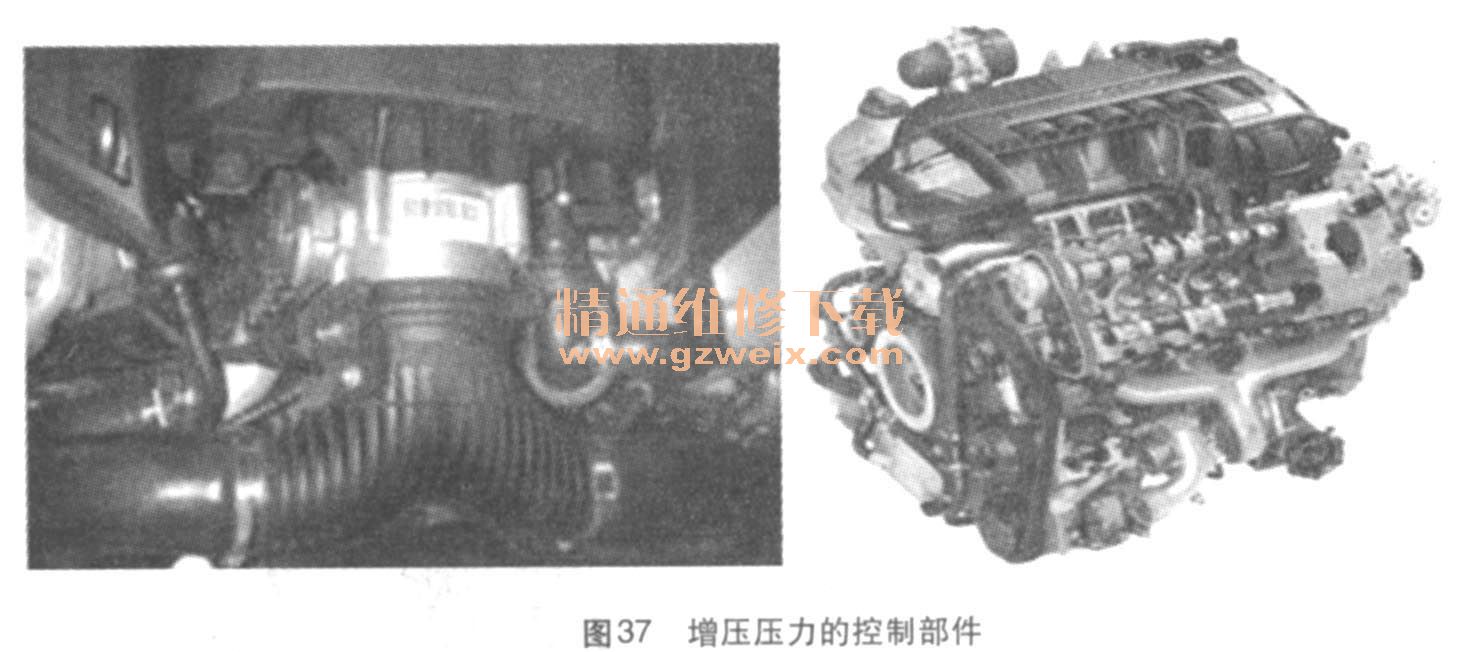 電子節(jié)氣門前面的增壓壓力傳感器會檢測增壓壓力。和帕拉梅拉S中一樣,在進(jìn)氣歧管背面的檢測發(fā)動機(jī)負(fù)荷的壓力傳感器會檢測進(jìn)氣溫度(如圖37所示)。DME控制單元通過啟用電動增壓壓力控制閥(安裝在左側(cè),靠近電子節(jié)氣門)來調(diào)節(jié)增壓壓力。這將調(diào)整相應(yīng)的控制壓力,以便啟用渦輪增壓器上的廢氣旁通閥。這樣就可將增壓壓力調(diào)節(jié)至在電子節(jié)氣門前的DME控制單元中計(jì)算出的增壓壓力設(shè)定點(diǎn)。