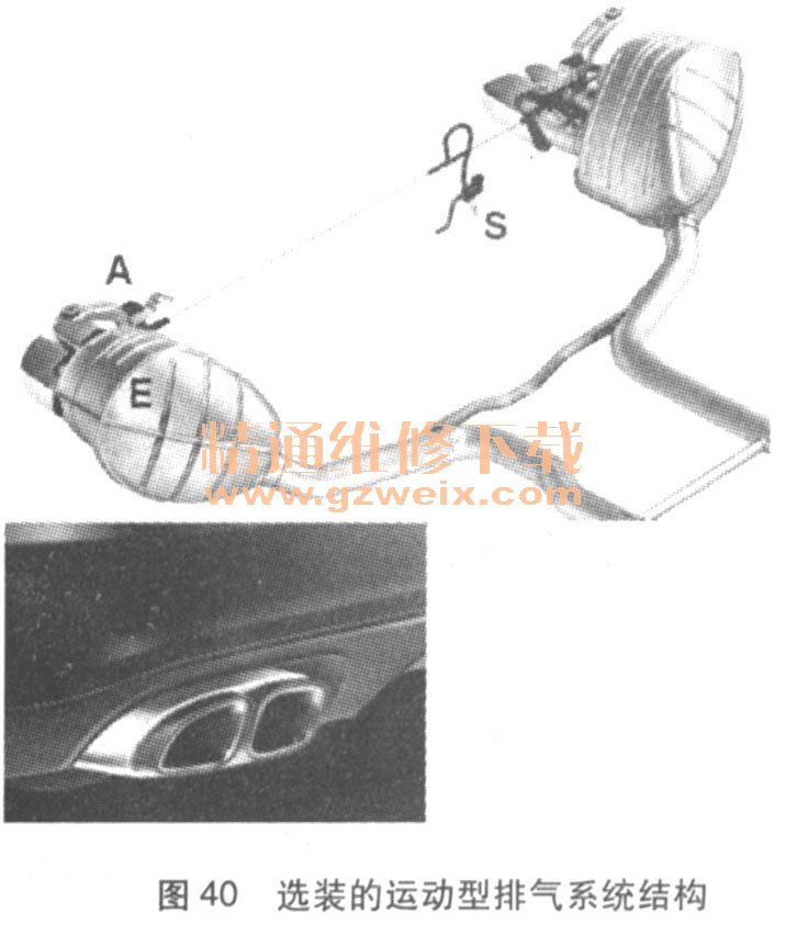 兩個后消音器(E)、真空控制的排氣活門(A)、真空控制的電動轉(zhuǎn)換閥(S)、對所有帕拉梅拉車型還另外提供了運(yùn)動型排氣系統(tǒng)(如圖40所示)。與標(biāo)準(zhǔn)排氣系統(tǒng)一樣,運(yùn)動型排氣系統(tǒng)的消音器之前也包括兩個初級催化轉(zhuǎn)換器和兩個主催化轉(zhuǎn)換器,以及一個中央消音器。主消音器可產(chǎn)生V8發(fā)動機(jī)典型的飽滿渾厚的聲音。與帕拉梅拉Turbo中的排氣系統(tǒng)一樣,每對后消音器與尾管頭之間各有兩個排氣活門,打開時可增大通氣量。尾管設(shè)計(jì)的特點(diǎn)是兩個帶有欽色飾件的引入注目的雙尾管,還配有與眾不同的不銹鋼雙尾管頭。中控臺中還集成了一個用\于啟用運(yùn)動型排氣系統(tǒng)的按鈕。運(yùn)動型排氣系統(tǒng)的聲音通過綜合考慮載荷,車速、發(fā)動機(jī)轉(zhuǎn)速和排擋因素來控制。這樣就可在按下按鈕時發(fā)出更飽滿的跑車聲音。
