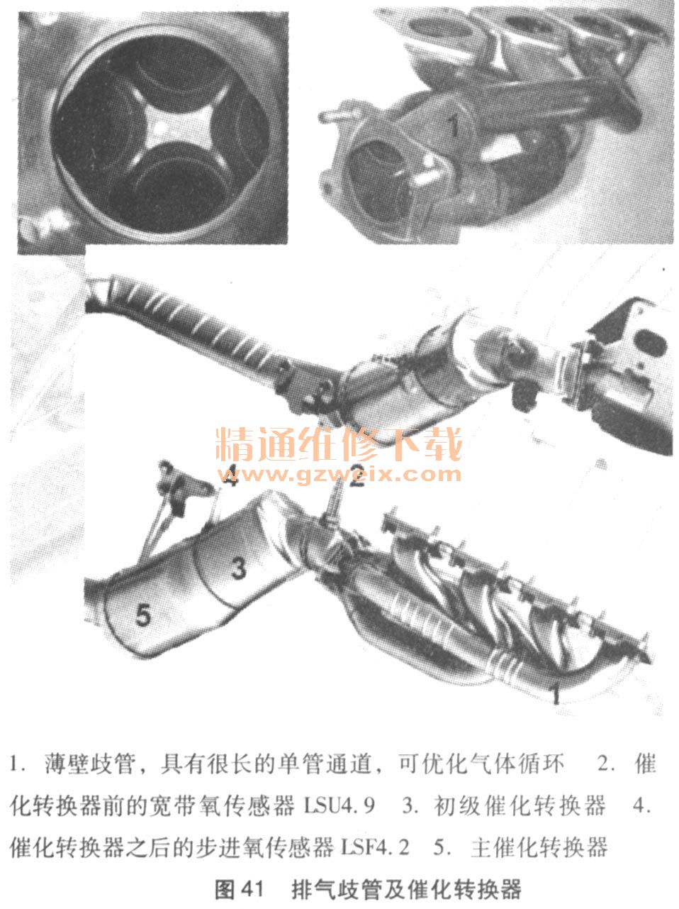 要使排放控制在低水平(特別是在冷啟動階段),催化轉(zhuǎn)換器必須能快速達(dá)到最佳工作溫度。為此,所有帕拉梅拉車型的排氣歧管都非常短,以便用高排氣溫度加熱催化轉(zhuǎn)換器(如圖41所示)。這樣就可快速加熱高效的初級催化轉(zhuǎn)換器和主催化轉(zhuǎn)換器,并保證有效的控制排放。催化轉(zhuǎn)換器前方特定于汽缸列的LSU氧傳感器和催化轉(zhuǎn)換器后方的LSF氧傳感器會將廢氣成分告知DME控制單元。然后DME控制單元就可使用該信息對特定于汽缸的混合氣控制進(jìn)行有針對性的干預(yù)。這樣就確保了車輛達(dá)到乃至超過最嚴(yán)格的排放標(biāo)準(zhǔn)一對帕拉梅拉S和4S而言,在歐洲是EU5 ,在美國則是ULEV。