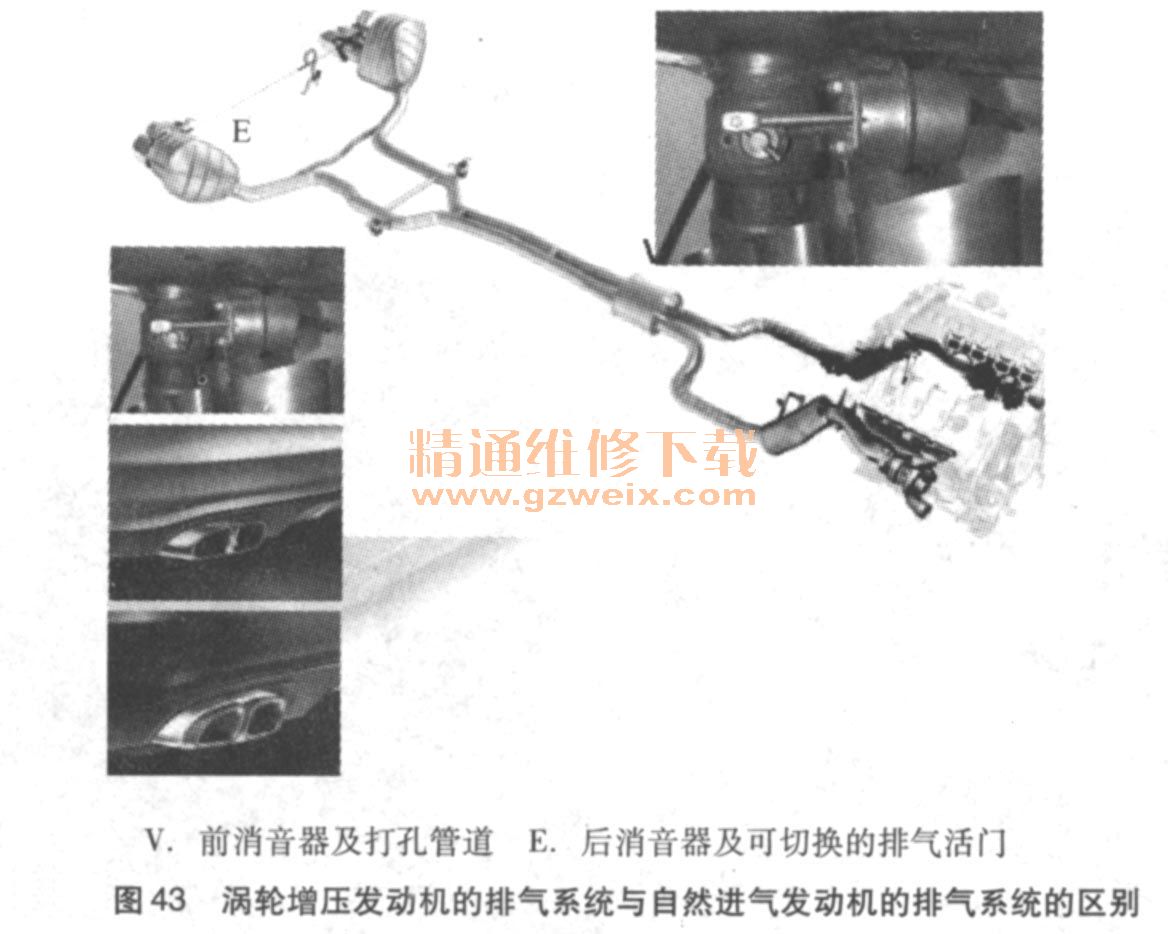 V8渦輪增壓發(fā)動機(jī)的排氣系統(tǒng)與V8自然進(jìn)氣發(fā)動機(jī)的排氣系統(tǒng)相比有幾點(diǎn)不同(如圖43所示)。例如,帕拉梅拉Turbo上的排氣系統(tǒng)管道橫截面比V8自然進(jìn)氣發(fā)動機(jī)的排氣系統(tǒng)管道大。這樣一來,兩種排氣系統(tǒng)中的廢氣流速就在同一水平。V8自然進(jìn)氣發(fā)動機(jī)上安裝了分支藕合連接,而在V8雙渦輪增壓發(fā)動機(jī)上則省略了此部件。后者是以打孔的管道穿過中央消音器的共用室。這樣可起到與分支藕合連接相同的效果。與V8自然進(jìn)氣發(fā)動機(jī)一樣,V8渦輪增壓發(fā)動機(jī)的后消音器顯然是作為設(shè)計(jì)元件安裝的。帕拉梅拉Turbo的廢氣通過兩個暗銀雙尾管排出,這些尾管的設(shè)計(jì)與V8自然進(jìn)氣發(fā)動機(jī)的尾管不同。這些尾管與帕拉梅拉S/4S的尾管不一樣,它們是矩形的。通過后消音器中的特定隔音和管道走線,以及特別設(shè)計(jì)的尾管,在所有發(fā)動機(jī)轉(zhuǎn)速范圍都可獲得最佳聲音。V8渦輪增壓發(fā)動機(jī)的排氣系統(tǒng)可以自動在兩種工作狀態(tài)間切換。因此,在轉(zhuǎn)速較低的范圍噪聲水平很低,而在轉(zhuǎn)速較高的范圍和節(jié)氣門全開時由于通氣量提高,噪聲水平也會提高。通氣量提高是因?yàn)槲挥诿繉笙羝髋c尾管頭之間兩個排氣管之一的排氣活門會打開。這樣就使每個消音器中的第二根排氣管開放。運(yùn)動型排氣系統(tǒng)可以選裝雙尾管頭。