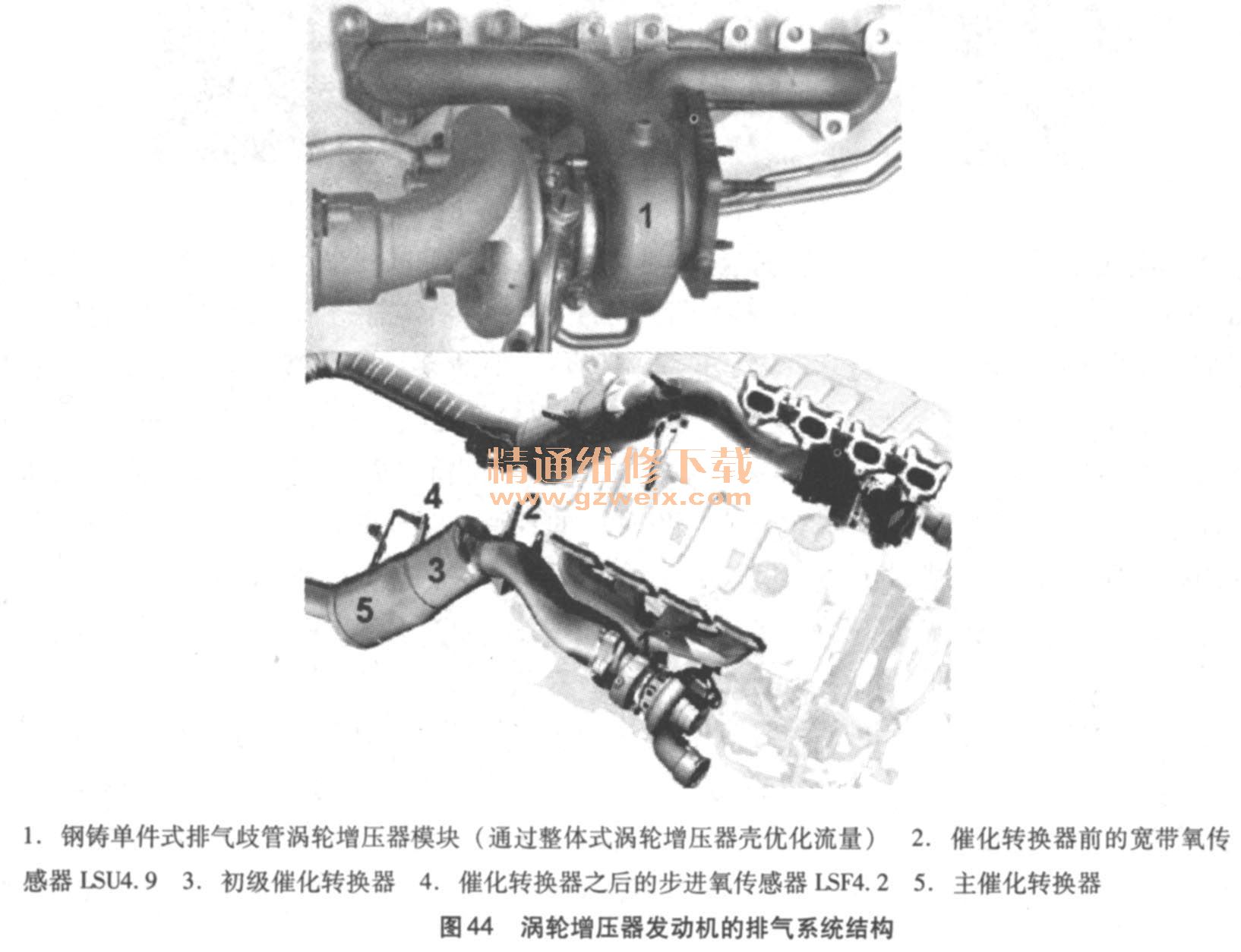 保持捷V8發(fā)動機(jī)第一次裝上了無中間法蘭的耐高溫鋼鑄單件式排氣歧管渦輪增壓器模塊,如圖44所示,催化轉(zhuǎn)換器前方特定于汽缸列的LSU氧傳感器和催化轉(zhuǎn)換器后方的LSF氧傳感器會將廢氣成分告知DME控制單元。然后DME控制單元就可使用該信息對特定于汽缸的混合氣控制進(jìn)行有針對性的干預(yù)。這樣就確保了車輛達(dá)到乃至超過最嚴(yán)格的排放標(biāo)準(zhǔn),對帕拉梅拉Turbo而言,在歐洲是EU5,在美國則是LEV。