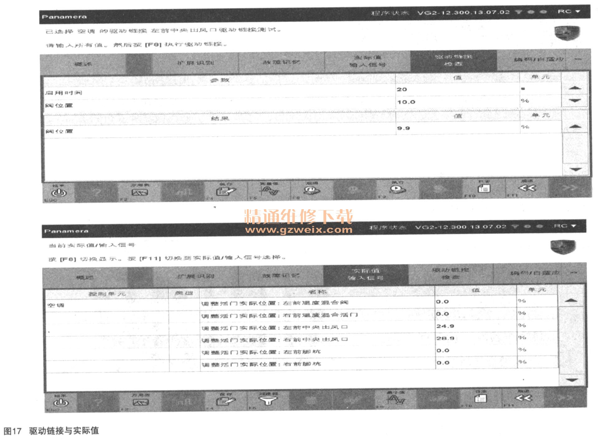 另讀取左前側(cè)出風(fēng)口溫度26.8℃,右前側(cè)出風(fēng)口溫度14.5℃,左右側(cè)出風(fēng)溫度確認存在差異。進行出風(fēng)口轉(zhuǎn)換風(fēng)門的實際位置測試,開關(guān)各個送風(fēng)模式,通過實際值觀察,無明顯故障點顯現(xiàn),調(diào)整活門位置正確(如圖17所示)。